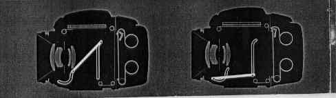 The reflex mirror of the Bronica S is an exclusive original. It will not flip up for the exposure as in other single lens reflex cameras. It moves forward and down with greater clearance provided for deeply seated lenses, permitting shorter focal length to be used without mirror interference. Thus, the Bronica S can be equipped with a normal 75mm lens, or with a 50mm wide angle. After the exposure, the Bronica mirror instantly - automatically returns to viewing position.