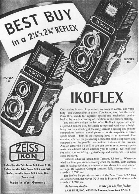 The above ad will answer many questions about the Ikoflex TLR cameras. These models are especially desirable among both collectors and users because of their Zeiss optics and general standard of construction. Unfortunately, you won't see them at prices near those of the new ones shown in the ad!