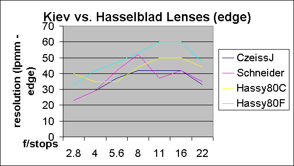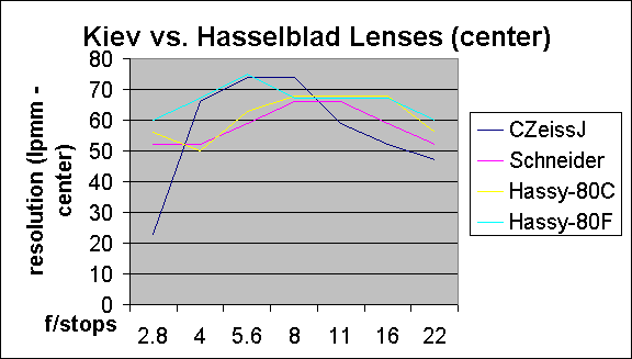 From kiev88 mailing list: Date: Fri, 9 Aug 2002 From: "Jay Y Javier" nikitakat@edsamail.com.ph Subject: Re: Photo testing Not scientific, rather more pragmatic. I have been to occasions when the Kiev 88 (with its lenses) were used alongside more expensive Mamiyas and Hasselblads. Minus the clues like the larger 6x7 format or the "double-v" notched Hassy square frames, it is hard to tell which transparency was shot with which camera/lens when the frames are laid side by side. The Kiev optics are capable of expensive-looking pictures :) Jay
