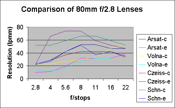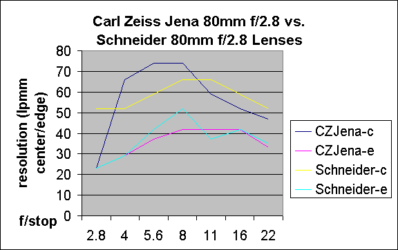 From russian camera mailing list: Date: Fri, 20 Dec 2002 From: dave_mason@juno.com Subject: Re: Russian lens tests The Soviets only gave a single center/edge or center/corner measurement, probably with the lens wide open. Resolution should be better with each lens stopped down two or three stops. For practical purposes with 35mm what counts most is not ultimate resolution but contrast (MTF) at about 20 lpm, which means how cleanly light and dark points that end up spaced about 1/1000" apart on a negative are tonally separated. Not coincidentally, this is the circule of confusion used to compute depth of field. In a 10x enlargement those points will be about 1/100" apart. What happens out beyond 20 lpm is of diminishing importance in influencing our subjective sense of sharpness. Of course you should adjust this critical point as film size and enlargement ratio changes. For instance if you routinely enlarge 35mm to 16x20 the critical resolution becomes about 32 lpm.