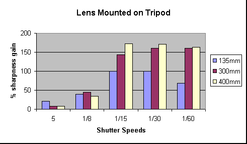 The above chart shows the data for the camera mounted on the tripod (rather than the lens) when using mirror lockup. The gains are less in terms of percentage, with the 135mm resolution values being fairly similar in both cases. But the lens mounted on the tripod produced higher resolution results in the sub-second exposures at both 300mm and 400mm. This observation is in keeping with the usual expectation that a long telephoto lens with mounting foot is probably best used mounted on the tripod, rather than the camera body. Moreover, the longer lenses put a lot of torque and weight on camera mounts, so most of us would prefer to use a lens on tripod mounting scheme to minimize the weight on the camera mount.